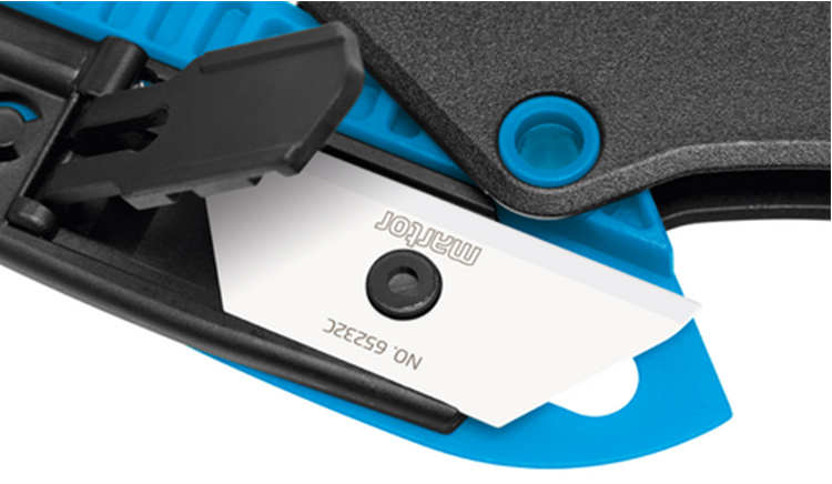 無(wú)需額外工具便可更換刀片,且完全無(wú)需拆卸。相反:按下刀片更換按鈕并完全翻開藍(lán)色壓桿,即可更換刀片。