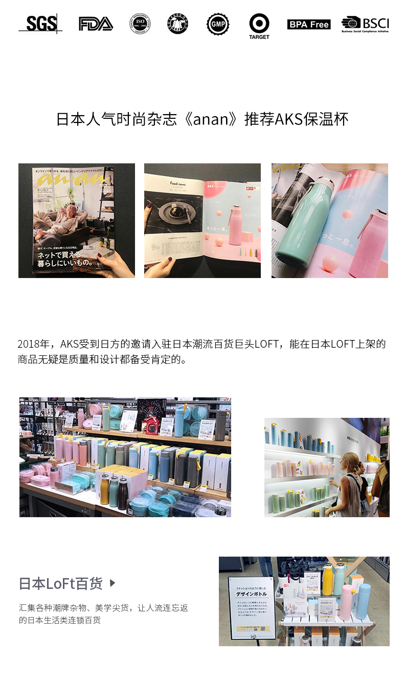 AKS 真空保溫杯均通過(guò)SGS質(zhì)量檢測(cè)認(rèn)證,材質(zhì)符合美國(guó)FDA標(biāo)準(zhǔn)。 其產(chǎn)品設(shè)計(jì)更屢獲國(guó)際獎(jiǎng)項(xiàng),包括德國(guó)紅點(diǎn)設(shè)計(jì)獎(jiǎng),德國(guó)iF設(shè)計(jì)獎(jiǎng),德國(guó)設(shè)計(jì)獎(jiǎng),澳大利亞設(shè)計(jì)獎(jiǎng)等等。 產(chǎn)品出口至全球數(shù)十個(gè)國(guó)家,讓大眾分享高質(zhì)量,高創(chuàng)意的生產(chǎn)成果。