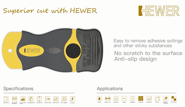HEWER安全刮刀,既不會(huì)刮傷原來的物品,又能輕松去掉黏膠垢以及機(jī)器污垢等污漬;這款刮刀還可以輕松去除貼紙以及不干膠,而且還非常安全,不會(huì)刮傷自己,非常適合生活或者工作當(dāng)中使用。