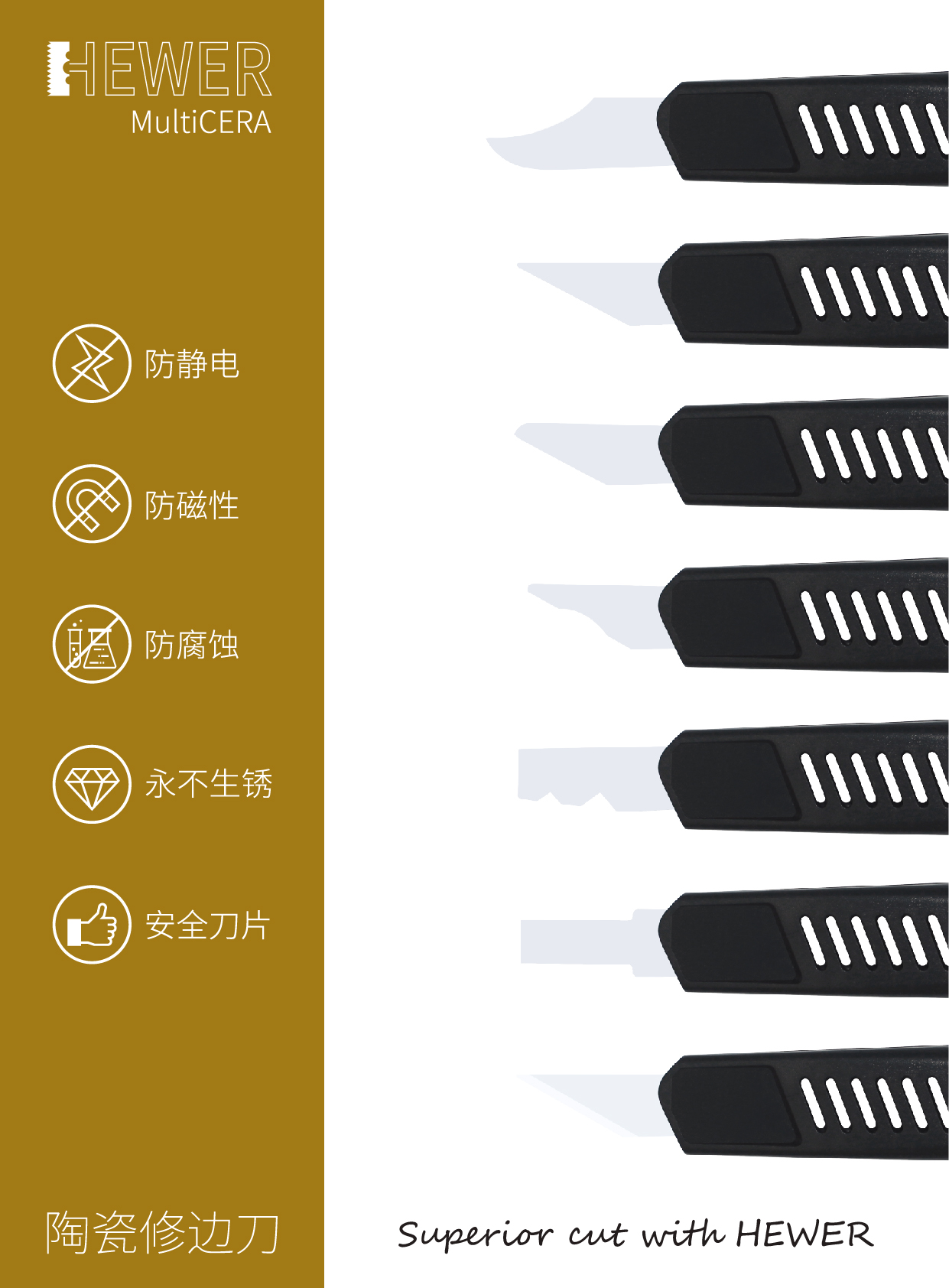 HEWER MultiCERA 安全陶瓷修邊刀可配合多款不同形狀的刀片使用,讓您在不同角度下進行工作。而其刀柄除了采用超耐用的玻璃尼龍材質(zhì),還附有備用刀片庫,可讓您輕易地在多款刀片之間進行切換,方便又好用!HEWER MultiCERA 安全陶瓷修邊刀擁有特別設(shè)計的纖細(xì)刀柄,可讓您以各種刁鉆的角度,將刀片伸至許多難以觸及的地方來進行切割作業(yè)。